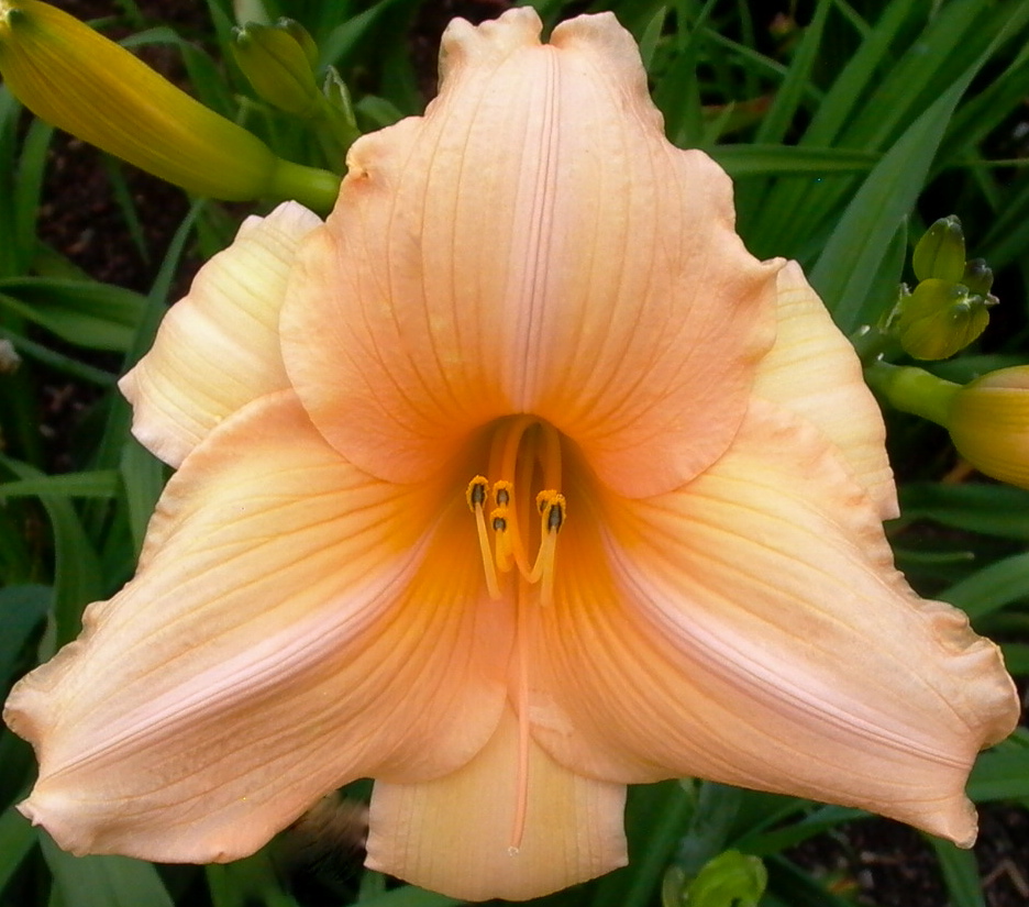 Pale cream, overlaid pale pink, orchid midribs, yellow throat